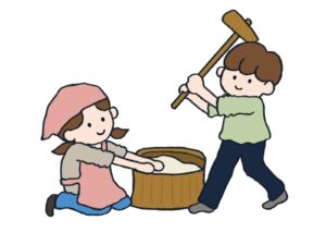 杵と 合いの手を 交互に入れることで、おいしい餅がつきあがります